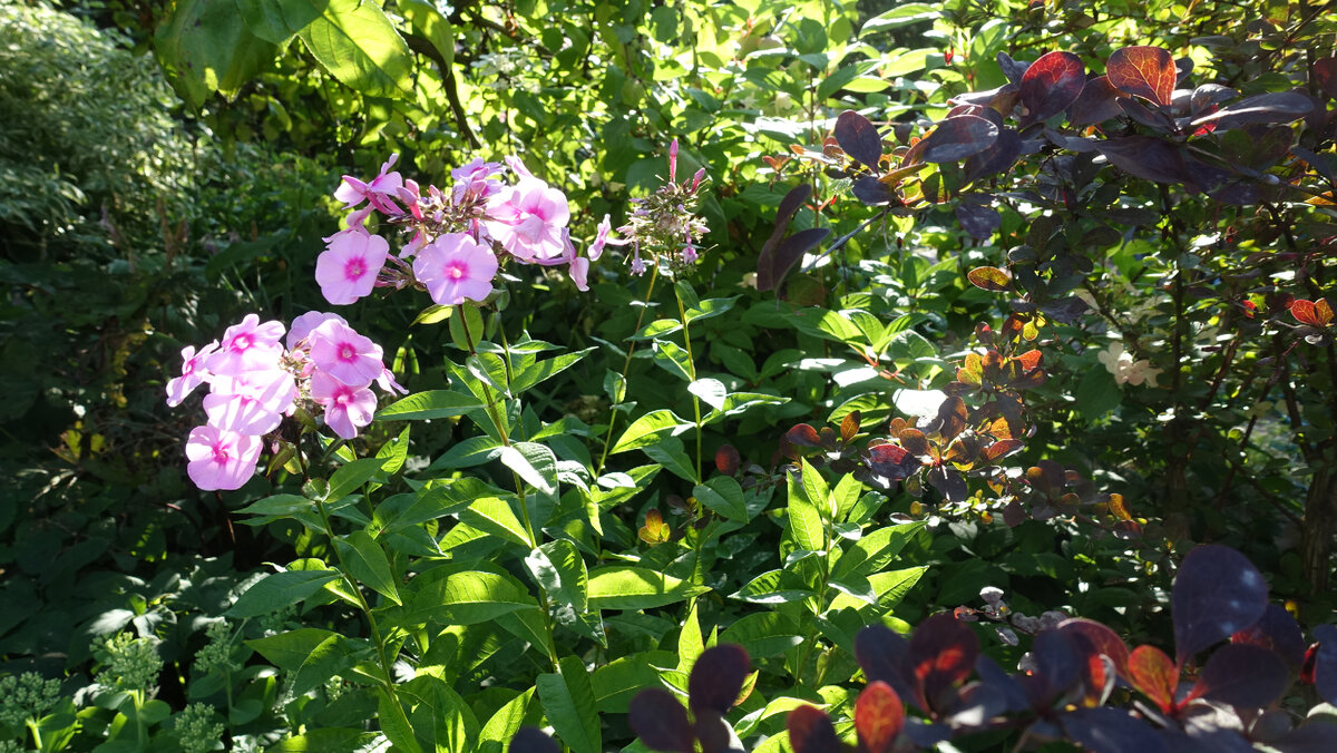 Чуть дальше от ствола солнца намного больше. Здесь растут флоксы (в тени они тоже цветут, но декоративности мешает мучнистая роса), астильбы, очитки, новобельгийские астры, лилейники, гортензии и т.п.