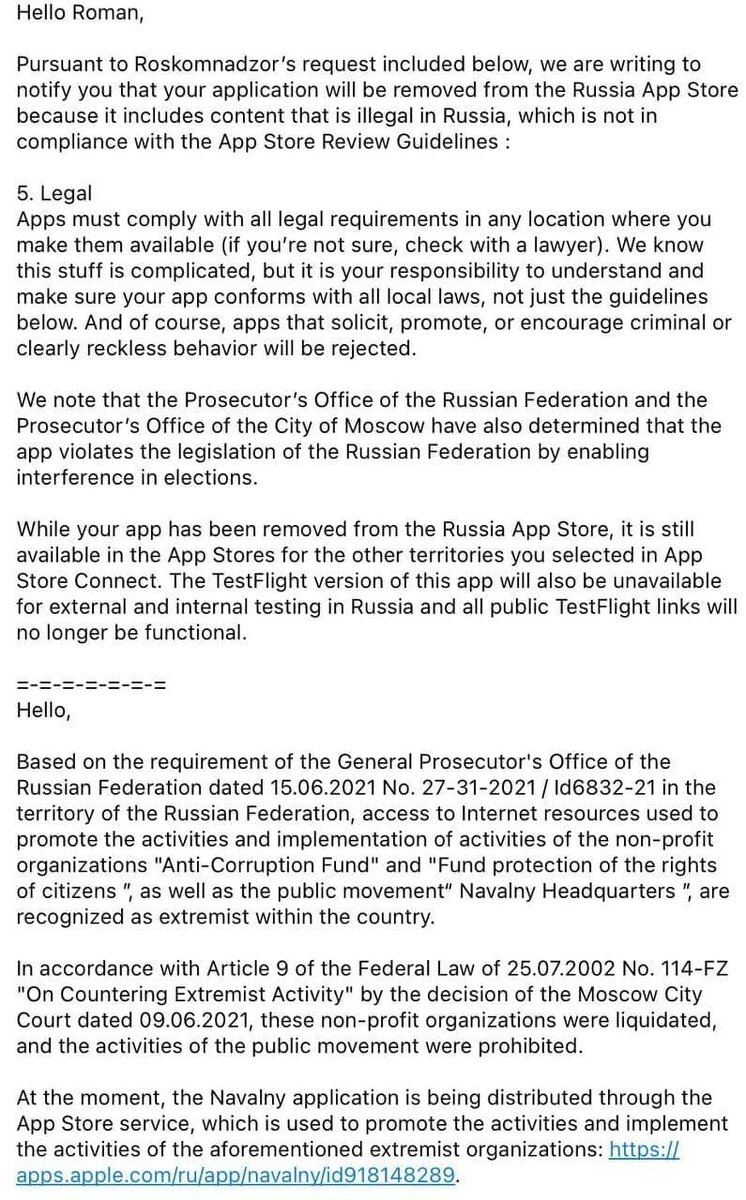 удаления приложения "Навальный" из App Store стало признание ФБК экстремистской организацией. Об этом говорится в ответе компании, который опубликовал соратник Алексея Навального Иван Жданов. В Apple также уточняют, по версии Роскомнадзора и Генпрокуратуры РФ, приложение Навальный содержит "запрещенный в России контент" и "позволяет вмешиваться в выборы".В Apple заявили, что поводом для удаления приложения "Навальный" из App Store стало признание ФБК экстремистской организацией. Об этом говорится в ответе компании, который опубликовал соратник Алексея Навального Иван Жданов.