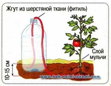 Устройство системы фитильного полива не стоит ровным счетом ничего. Возьмите использованные пластиковые бутылки (по 5 л или больше) и вкопайте их на 1/4 либо на 1/3 (чтобы только не падали) вдоль посадок через каждые 1,5-2 м. Опустите в емкости до дна концы жгутов из шерстяной ткани, ниток (предварительно намочив их). Противоположные концы жгутов закопайте в почву вдоль рядов растений на 10-15 см в глубину.