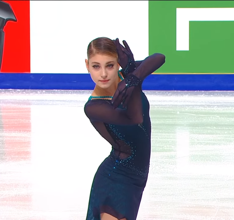 Тройной лутц… хорошая группировка и крутка, но… нарушена центровка, и она просто «проскользнула» на приземлении. Это довольно необычно, потому что в воздухе все выглядело хорошо.