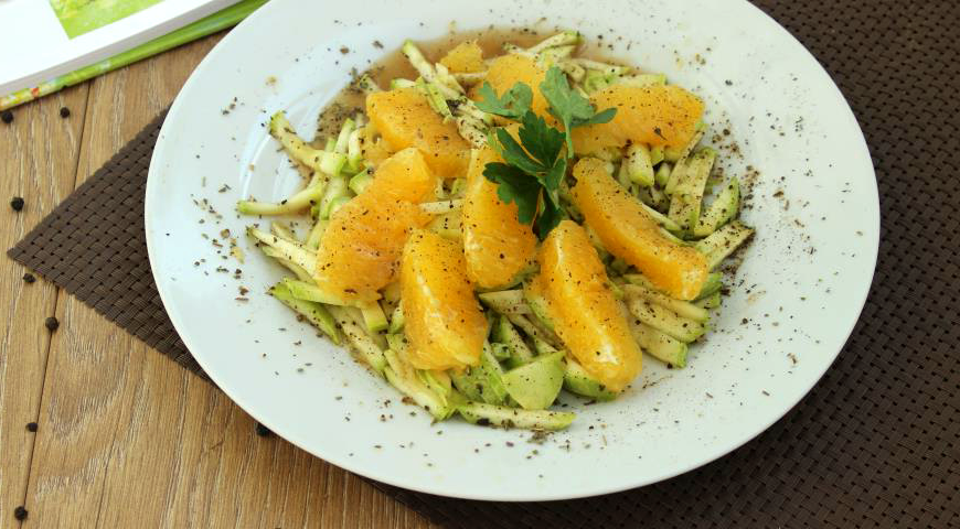Пикантный, вкусный летний салат из молодого кабачка с апельсином по рецепту актера Оскара Кучеры. Готовится быстро и просто.