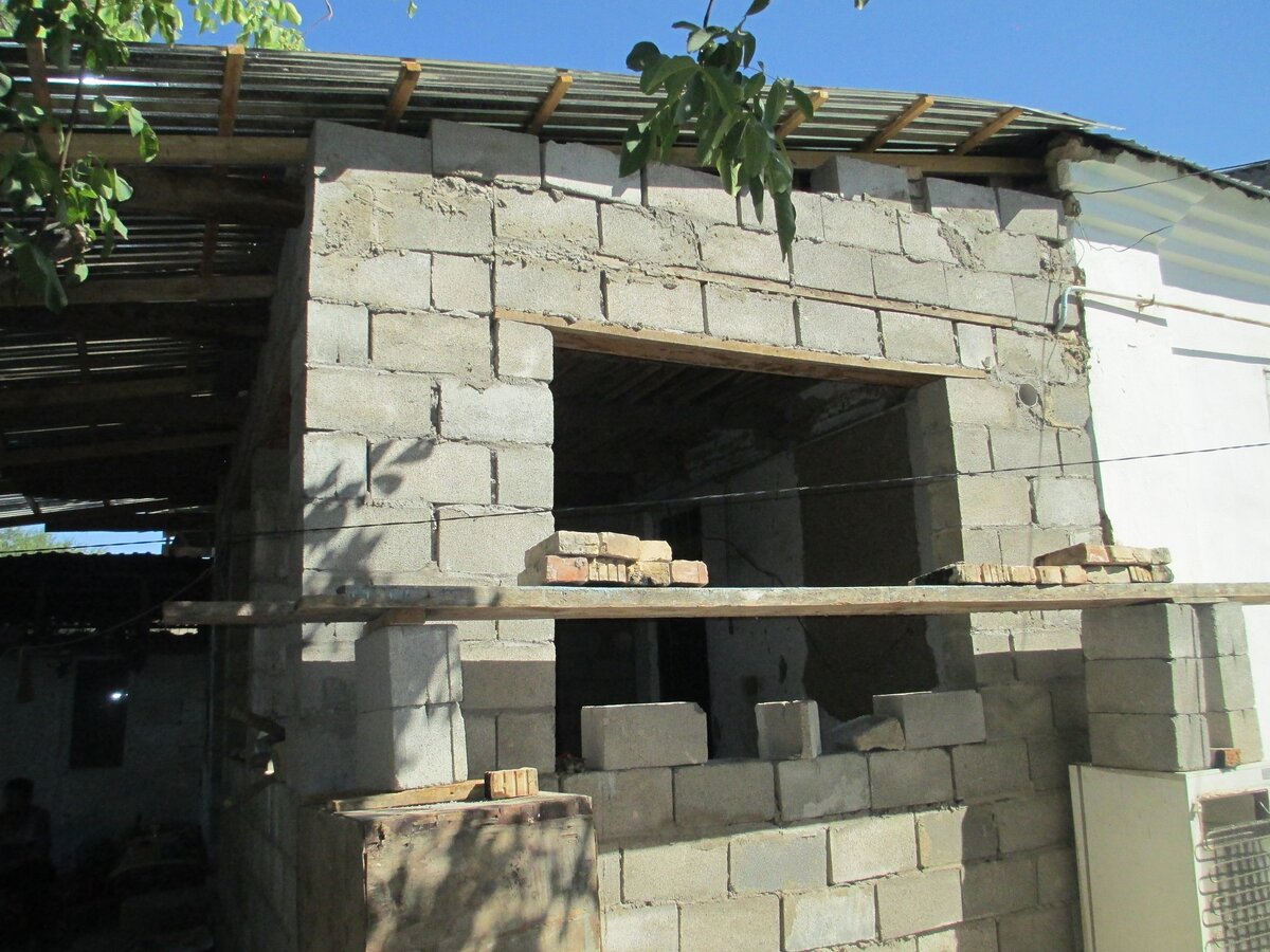 Над дверью и окном проще всего положить армированную балку, опирая её на 150—200 мм на края. Использование U-образного блока потребует установки подпорки вровень со стеной, и заливки раствора. Для арматуры в прилегающих блоках нужно сделать пропилы. Бюджетный вариант с уголком для придания эстетики усложняется подпиливанием блоков на толщину уголка. Кроме того, металл нужно обработать антикоррозийной краской и обернуть 2-3 раза сеткой под штукатурку.