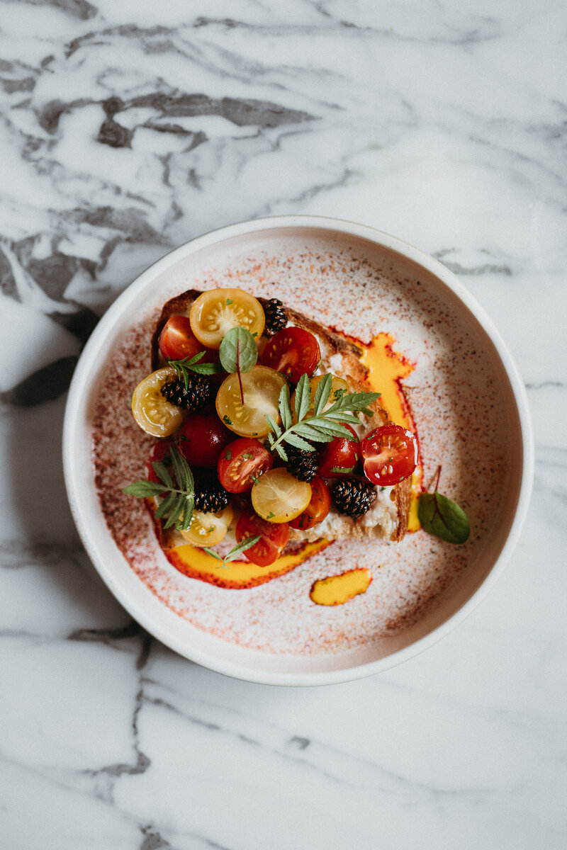 Первое пространство — городское гастрокафе. Стеклянный винный шкаф, темные обои в китайском стиле шинуазри, черные глянцевые столы и изумрудный диван — декадентский полумрак, приглашающий на бокал вина и закуски. Неклассический винегрет (400 руб.) со свеклой из печи, тюлькой на бриоши и кремом из чеснока, брускетта с черри и вареньем из еловых шишек (350 руб.). Зеленые позиции со свежим взглядом на русскую гастрономию: окрошка с ростбифом на бульоне из щавеля и огуречного рассола (550 руб.) и мини-перцы, фаршированные чукой, во французском демигласе из капусты (800 руб.). Другие разделы меню — паста, рыба, мясо — представлены избранными блюдами.