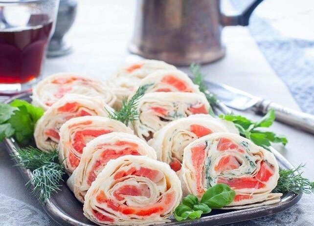 Это очень популярная и простая закуска для праздничного стола. Для рулета из лаваша можно брать любую слабосоленую рыбу семейства Лососевых. Это может быть семга, лосось, кижуч и любая другая. Все ингредиенты этого блюда уже готовы к употреблению, поэтому на приготовление закуски у вас уйдет не более 10 минут. Чтобы было проще заворачивать рыбу в лаваш, ее филе нужно предварительно подержать 1 час в морозилке, а затем нарезать острым ножом на очень тонкие слайсы. Ингредиенты: Пошаговое приготовление рулета из лаваша с красной рыбой: Нарезанные кусочки лаваша с семгой будут красиво смотреться на свежих листьях салата. Сверху их можно украсить веточками укропа или любой другой зелени.