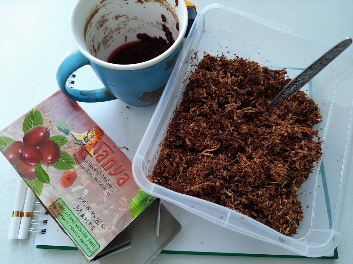 Много раз читал, но сам ни разу не пробовал. Это я об ароматизации табака безникотиновой смесью для кальяна. На днях мне представился такой случай. Знакомая от щедрой души выдала мне три коробки такой смеси, которые когда-то она привезла из Турции. Срок годности продукта уже вышел. Но не думаю, что аромат от этого станет менее заметный. Внимание! Все мои записки предназначены для совершеннолетних граждан. В первую очередь для тех, кто курит. Курение вредит здоровью. Я не рекламирую табачную продукцию и продавцов, и не пропагандирую курение. Данная записка основана на личном опыте и носит ознакомительный характер. Коробка безникотиновой кальянной смеси со скромным русским названием ТАНЯ выглядит так: В данном случае у меня аромат Манго. Не знаю, сколько сейчас стоит такая смесь, но тогда она обошлась знакомой в сущие копейки. Иначе она бы не везла ее целый чемодан из-за моря. В коробке содержится вязкая масса красного цвета, запакованная в несколько целлофановых пакетов. Я отделил прим