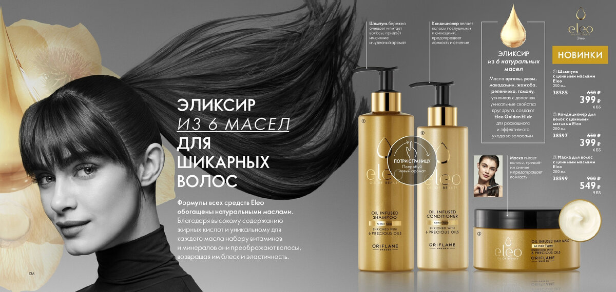 Средства для ухода за волосами со скидкой 39%, в новом каталоге Орифлэйм, только до 2 октября 2021 года. 38585 Шампунь с ценными маслами Eleo. Этот роскошный шампунь бережно очищает волосы и кожу головы. Образует густую пену. Эффективно защищает волосы от повреждений. В состав шампуня входит Golden Elixir, который содержит шесть видов натуральных масел. Они питают волосы изнутри и оставляют после себя потрясающий аромат. 250 мл. 38597 Кондиционер для волос с ценными маслами Eleo. Невероятно шелковистая и роскошная текстура этого кондиционера для волос питает волосы, защищает от ломкости и облегчает расчёсывание. В состав кондиционера входит Golden Elixir, который содержит шесть видов натуральных масел. Они питают волосы изнутри и оставляют после себя потрясающий аромат. 200 мл. 38599 Маска для волос с ценными маслами Eleo. Подари своим волосам глубокое увлажнение, интенсивное питание, сияние и гладкость. Эта превосходная маска для волос с богатой кремообразной формулой содержит в с