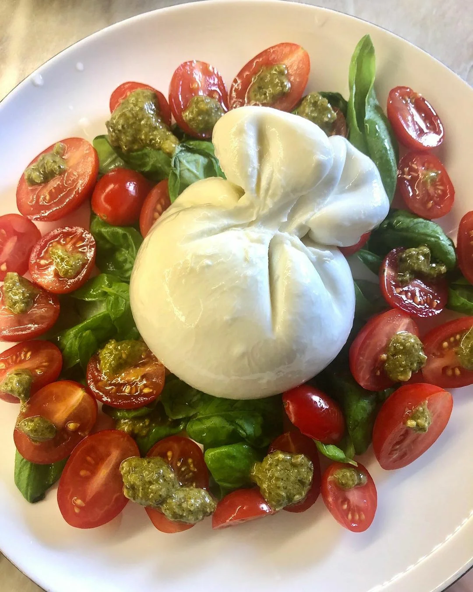 Знаете ли Вы, что БУРАТТА-это итальянский свежий сыр, изготовленный из сливок и молока коров или буйволиц. Собой представляет мешочек из моцареллы наполненный начинкой. Идеален в сочетании помидорок, рукколы, базилика (можно Песто) и на любителя оливок. Я люблю помидорки и Песто и очень люблю со спаржей ❤️😍 и чтоб перчик чёрный свежемолотый, как же это вкусно!