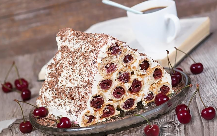 Сначала собираются трубочки с вишней. После каждую смазывают кремом и аккуратно выкладывают между собой, придавая торту вид избы