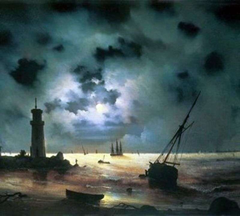 Одна из самых ранних работ феодосийской коллекции художника и относится к ученическому периоду, когда Айвазовский занимался в Петербургской Академии художеств. Написана картина в 1837 году. Еще заметно явное влияние М. Н. Воробьева – учителя и наставника будущего величайшего живописца: море не так естественно, как в последующих работах, небо, скорее надумано пугающее, чем реалистичное, да и детали картины от коряги и лодки на ближнем плане до раскачивающихся в разные стороны парусных судов у горизонта на дальнем – больше подошли бы к полотну, выполненному в жанре фантасмагории. Еще заметно, однако – это не слепое подражание учителю, и далеко не имитация образцов живописи, авторитетных основоположников жанра. Айвазовский ставил себе задачей передать тщетность человеческого существования, будто зажатого с двух сторон водной и воздушной стихией. Несмотря на то, что сюжет картины разворачивается в ночное время, луна не так высоко поднялась над горизонтом, а маяк все еще не горит.