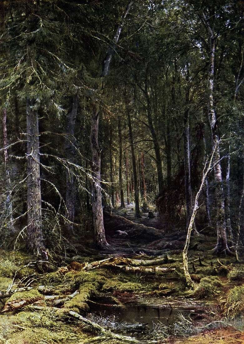 В 1872 году активно развивается талант И. И. Шишкина. Как раз в это время формируются его взгляды на искусство. В этом году художник пишет полотно “Лесная глушь”. Густой дремучий лес как будто знает много тайн, но никогда и никому их не расскажет. В нем нет спиленных деревьев, они падают только от сильного ветра. Многолетние ели тянутся к солнцу и раскидывают свои ветви, переплетая их с ветками соседних деревьев. Слева и справа между деревьями даже не видно просвета, настоящая глушь. Зато в центре как будто выход и виднеется освещенная солнцем небольшая поляна, за которой вновь начинается неприступный лес. На переднем плане похоже находится болото. На нем лежат несколько поваленных деревьев и некоторые из них уже полностью покрыты мхом. Если бы человек оказался в этом месте, то вряд ли бы он смог преодолеть это болото. Ощущение что зыбкое место тянется вплоть до той поляны, где виднеется солнце.Не сразу замечаешь лису на бревне у болота, которая спугнула какую-то птицу. По сравнению с