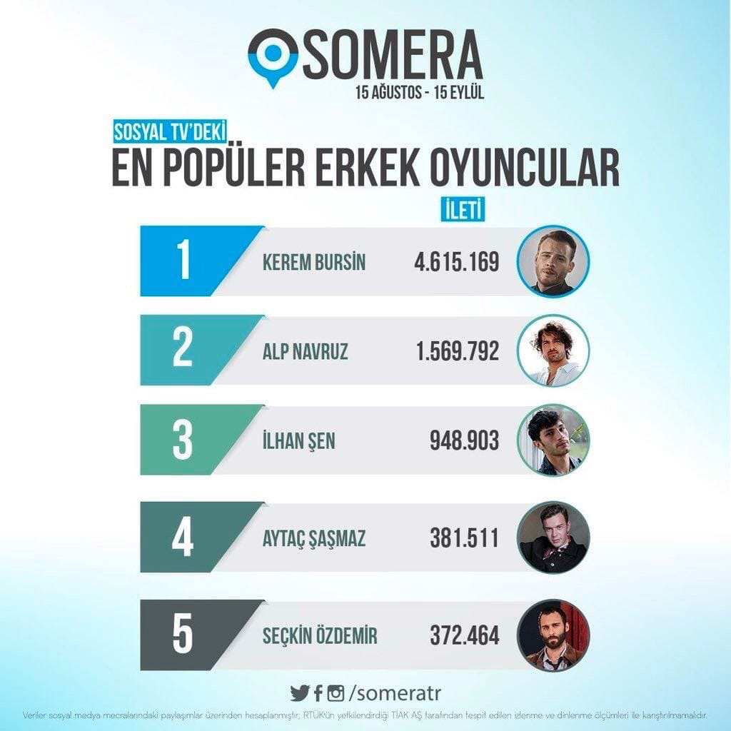 иногда буду писать для вас такие статьи, чтобы вы могли следить за актерами, которым сейчас отдаёт предпочтение общество в сети. Делюсь с вами рейтингом Somera. 5. Сечкин Оздемир Данный актёр сыграл главную роль в сериале «Беда на голову» с Ирем Хелваджиоглу. Этот проект уже закрылся, но Сечкин Оздемир до сих пор находится в пятерке самых обсуждаемых. 4. Айтач Шашмаз Айтач Шашмаз, по моему личному мнению, очень хороший актёр. У него есть талант, а также он обладает достаточной харизмой для того, чтобы играть в романтической комедии. Сейчас он играет в «Игре судьбы», которая неплохо держится в своих рейтингах. 3. Ильхан Шен Ильхан Шен тоже на данный момент играет в романтической комедии «Любовь Разум Месть», которая занимает первую строчку в рейтинге романтических комедий этого лета. В этом сериале он играет главную роль с Бурджу Озберк. 2. Альп Навруз Очень талантливый актёр. Это на самом деле так. Вместе с Айчой Айшин Туран они составили отличную пару в сериале «Сказка остров