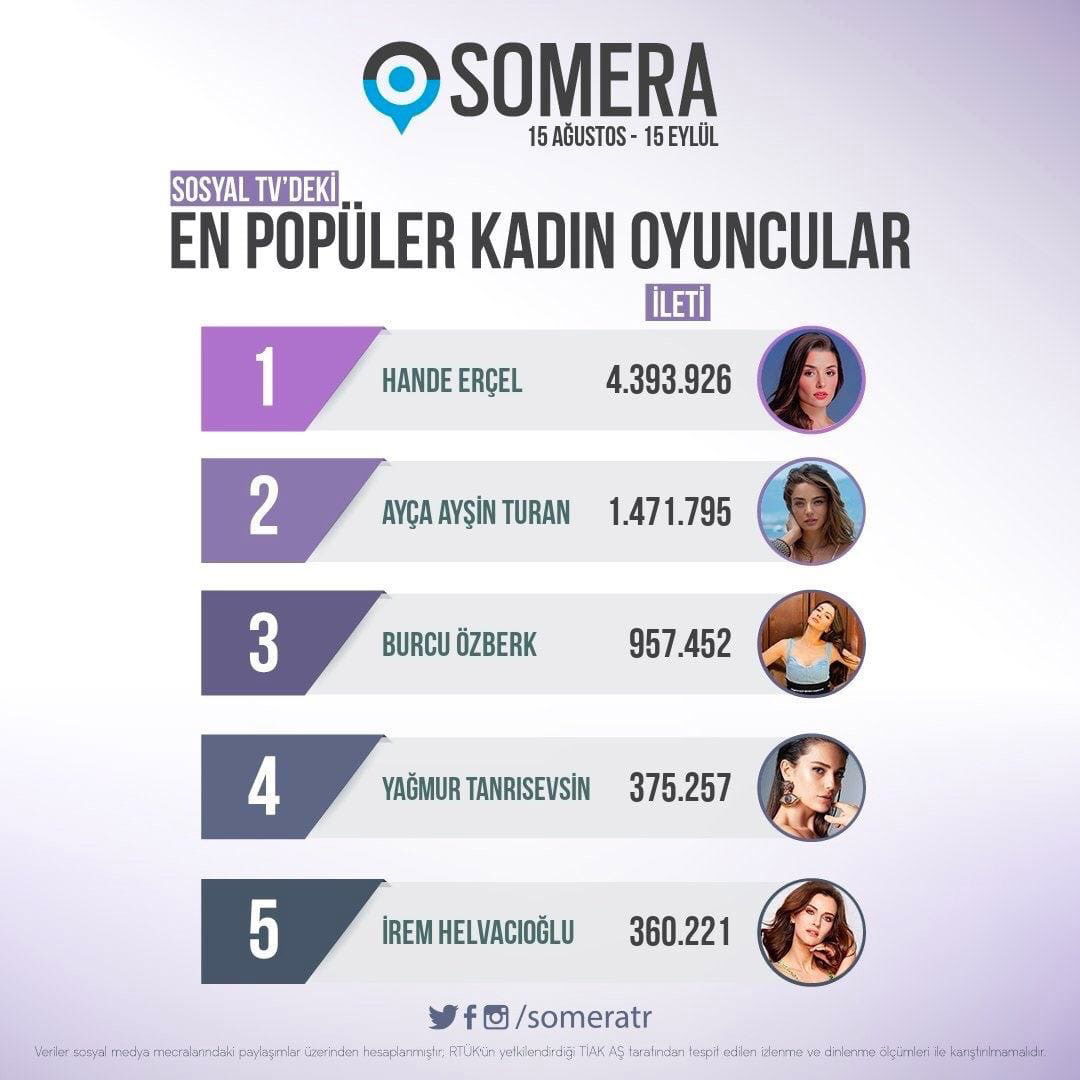 рейтинг Somera на самом деле идёт параллельно, то есть самые популярные актёры и актрисы располагаются по парам, они являются друг другу партнерами. 5. Ирем Хелваджиоглу Так же, как и Сечкин Оздемир, Ирем Хелваджиоглу вы знаете по сериалу «Беда на голову», завершившемуся недавно из-за низких рейтингов. Но надо признать, что Ирем тут заслуженно, ведь она достаточно талантливая актриса. 4. Ягмур Танрысевсин Актриса, на месте которой было бы логично расположиться Джемре Байсель, партнерше Айтача Шашмаза. Однако поскольку сериал «Сердечная рана» является вторым самым рейтинговым проектом этого лета, Ягмур Танрысевсин также очень нравится зрителям. 3. Бурджу Озберк Бурджу Озберк, разделившая главную роль в сериале «Любовь Разум Месть» с Ильханом Шен, расположилась так же, как и ее партнёр, на третьем месте в этой пятерке. С этим невозможно поспорить, ведь Бурджу очень хороша. 2. Айча Айшин Туран Эта актриса, которую вы можете знать, как ту, что сыграла в первом американо-турецком сер