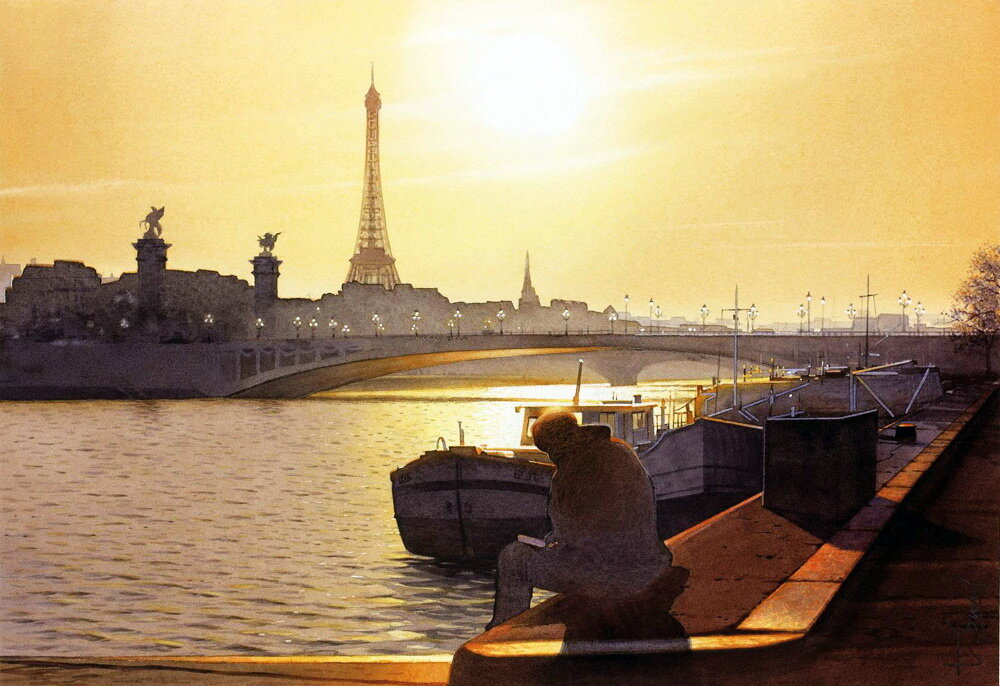 Доброго всем дня, дорогие читатели! Сегодня я хочу познакомить вас с великолепным французским художником - Тьери Дювалем. У Тьери очень добрый взгляд на мир. Он рисует наш мир таким, каким он мог бы быть, если бы люди были добрее друг к другу, если бы миром правили добрые мудрецы, если бы мир был полон любви и не было бы войн и болезней. Свет в акварелях Тьери Дюваля всегда играет самую главную роль, создавая эффект присутствия зрителя в той точке, куда его задумал поместить художник. А сам художник щедро делится увиденной красотой, освобождённой от всего негатива современной реальности. Каждая картина Тьери - это путешествие, причем, путешествие идеальное. Именно в таком спокойном, уютном, далёком от тревог месте хотел бы очутиться каждый путешественник. А ещё это немного путешествие во времени, примерно, в 60-70-е годы прошлого века, в "Золотой век" Европы и Азии, наполненный радостным ожиданием и уверенностью в будущем. Тьери Дюваль родился в 1957 году в Париже. И, думаю, именно вп