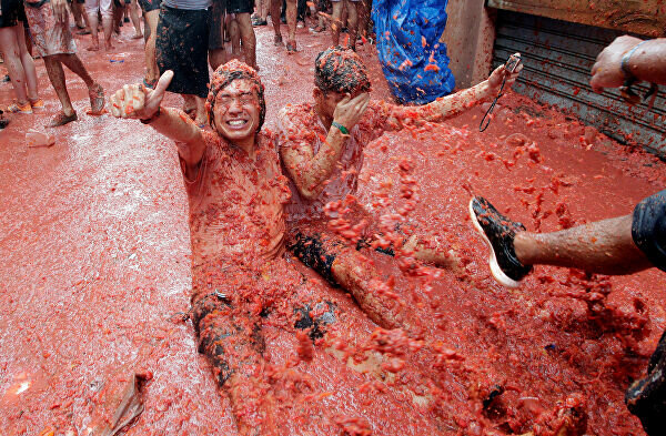 Ежегодный праздник в солнечной Испании в честь уходящего лета. Проходит каждую последнюю среду августа в городе Буньол. В чем же его особенность? Да в том, что улицы этого города превращаются в самую настоящую арену для битв, только вот не кулаками, а томатами. За 11 часов праздника расходуются более 1000 тонн помидор! Люди просто бросаются ими друг в друга, все это подает на землю и превращается в томатную кашу, уровень которой иногда доходит до 30-50 сантиметров.