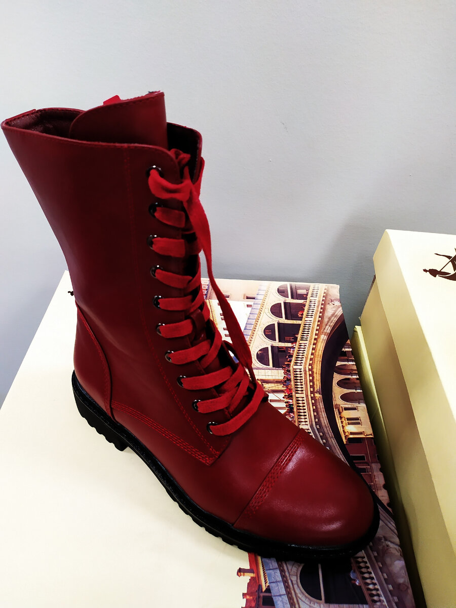 Высокие ботинки цвета бордо на низкой подошве со шнуровкой. Цена 2599 рублей.