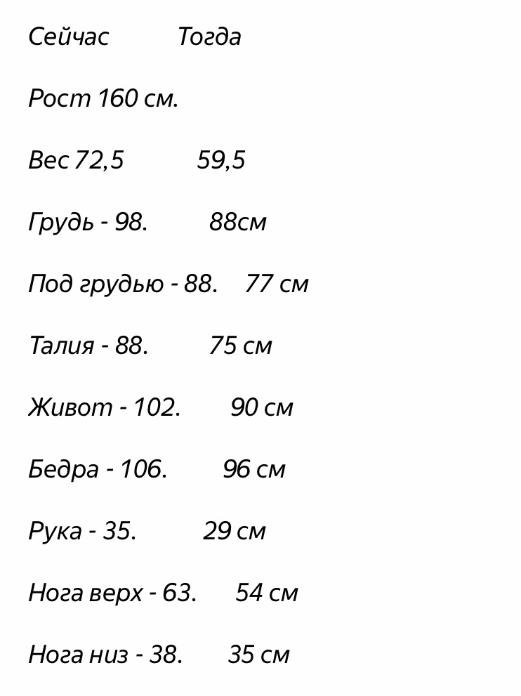 Замеры!!!! Решила с утра измерить свои параметры заново, вдруг уменьшаюсь? Итак, вес - 69,9. Всего-то минус 900г... очень мало Теперь по параметрам На фото то что было до и к чему я иду (не совсем конечно к чему, просто мои прошлые параметры) Сегодняшние измерения показали что: Грудь - 97 Под грудью - 86 Талия - 83 Живот - 102 Бедра - 104 Рука - 33 Нога верх - 61 Нога низ - 38 Опять же это слишком мало, но по крайней мере всё же в минус, а не наоборот) Взвесилась замерилась и аппетит не сильно проявлялся. Сегодня было Йогурт Вкуснотеево 750г -(79)- 592 кофе - 4 кружки - 120 всего 712 ккал. Постараюсь далее взять себя в руки и ... мне же лететь 3 октября на встречу, хотелось бы лучше результаты к этому дню. Виза ещё не пришла, так что я всё ещё на нервах, но думаю что всё получится и буду уже показывать что я там ем в заграницах этих ))