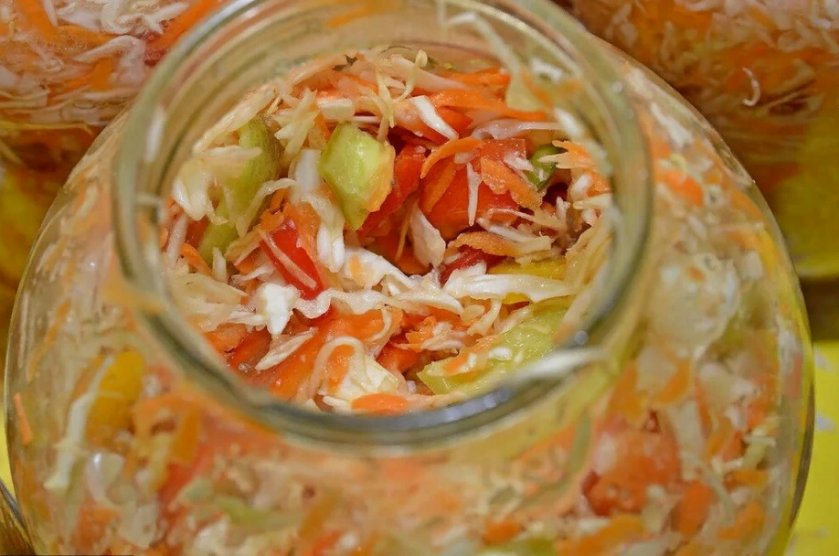 Салат из капусты Великолепное сочетание овощей, я собрала в этом рецепте. Благодаря своему изысканному вкусу, оно идеально подходит в качестве закуски. Нам понадобятся продукты: 5 кг. белокочанной капусты, 1 кг. моркови, 1 кг. репчатого лука, 1 кг. болгарского перца, 0.5 л. растительного масла, 0.5 л. уксуса 9%, 400 г. сахарного песка, 6 ст.л.соли крупного помола, смесь перцев кладем на вкус, Приготовление: С вилка капусты снимаем поврежденные листья, промываем, разрезаем на две части и шинкуем ножом на разделочной доске соломкой. Перекладываем капусту в кастрюлю, солим и оставляем на ночь, чтобы она пустила сок. Затем отжимаем сок. Морковь с луком очищаем, промываем и нарезаем ножом на доске соломкой. Сладкий перец, удалив семена, нарезаем тонкой соломкой. Все подготовленные овощи соединяем вместе, перемешиваем, солим, перчим, вливаем растительное масло, уксус, засыпаем сахарный песок. В стерилизованные сухие банки, складываем капустный салат. Закручиваем винтовыми кр