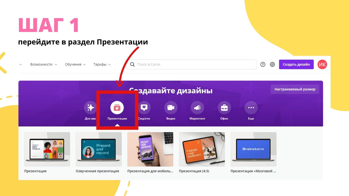 Оживите свою презентацию и сделайте ее еще круче с помощью гифок! В инструкции показываем, как вставить гифку в презентацию всего за пару кликов. Как вставить гифку в презентацию с компьютера Чтобы вставить гифку в презентацию, зарегистрируйтесь или авторизуйтесь в Canva. Шаг 1. Создайте презентацию Перейдите в раздел Презентации на главной странице редактора. Выберите подходящий формат: обычная презентация, мобильная, с озвучкой или любая другая. Добавьте картинки, текст и другие элементы на чистое рабочее поле, или выберите и примените один из готовых шаблонов. Шаг 2. Загрузите и вставьте свою гифку в презентацию Эта инструкция покажет, как вставить свою гифку в презентацию. Перейдите в раздел Загрузки на левой панели редактора. Нажмите кнопку Загрузить медиа. Нажмите Устройство, чтобы загрузить гифку с компьютера. Вы также можете брать гифки с Facebook, Google Диска, Instagram или Dropbox. Выберите гифку на компьютере и загрузите ее. Ваша гифка попадет в раздел Загрузки — Видео. Наж