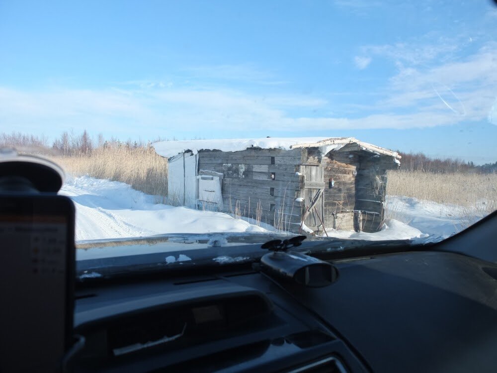 Вскоре после Нименьги мы подъехали к Тапшеньге, переправа через которую так впечатлила нас с товарищем в 2017 году. В этот раз переправа выглядела вполне традиционно, потому что стабильные морозы держались уже довольно долго. Рыбацкая хижина, в которой мы четырьмя годами ранее планировали прятаться от мороза, если всё-таки провалимся под лёд Тапшеньги, по-прежнему стоит на берегу.