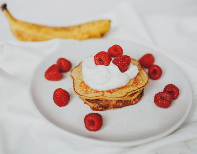 - Выложите блины на тарелку и сверху выложите смесь кленового йогурта и малины. Наслаждайтесь!