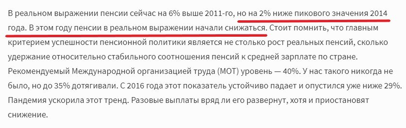 Журнал Форбс, основываясь на официальной статистике Росстата, сравнил размеры реальных пенсий россиян. "Реальные" - означает с поправкой на инфляцию, другими словами - сравнил их покупательную способность. И вот что получилось. Нынешние пенсии в реальном выражении на 2% ниже показателя 2014 года, когда они достигали пикового значения. То есть, за последние 7 лет не только не было их роста, но и наблюдается некоторое падение, в частности, оно происходит в текущем 2021 году. Исследования Форбс совпали с данными моего исследования, которое показало, что за последние 10 лет размер пенсий в долларовом эквиваленте снизился на 13% (если рассматривать с 2014 года - снижение будет еще сильнее). Но дальше по тексту авторы спешат напомнить, что главный критерий успешности пенсионной политики - это не столько рост реальных пенсий, сколько сохранение стабильного соотношения пенсий к средней зарплате по стране. Ну, то есть, наша пресловутая "стабильность". Но и со стабильностью у нас здесь не очень.