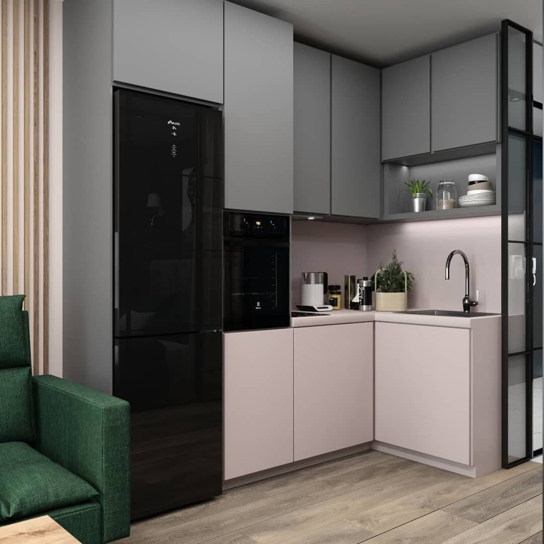 Кухня компактная, но оснащена всем необходимым. Гарнитур привычный — современный минимализм встречается всё чаще, — простой и довольно вместительный, выполнен в оттенках серого и пудровой розы. Цветовое сочетание могло бы выглядеть скучно, но в оформлении других частей квартиры использован интенсивный зелёный, и это здорово выручает.