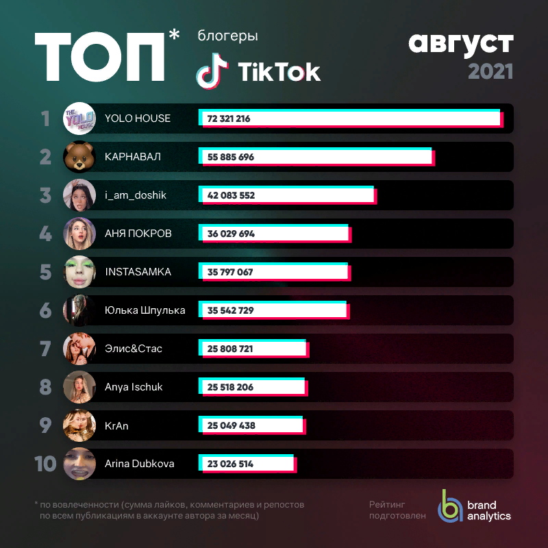 "В августе 15 из 30 участников рейтинга оказались в топ-30 впервые. При этом рост популярности этих участников вызван не сиюминутной славой и вирусными алгоритмами, а систематической работой с контентом на платформе", — говорится в исследовании.