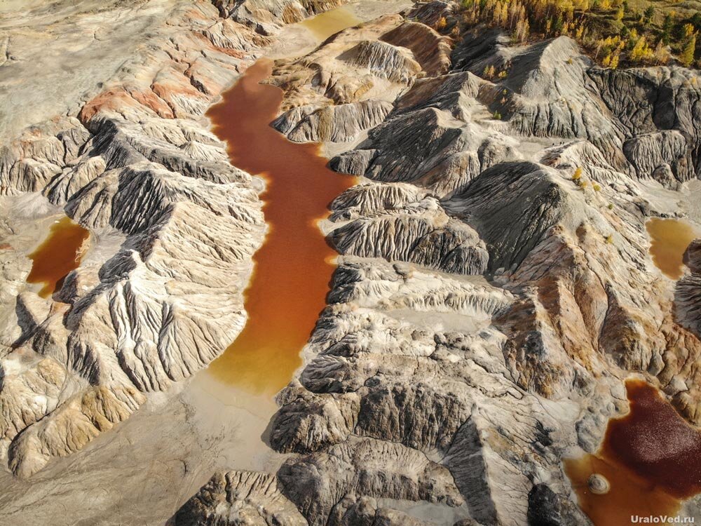 Одно из самых красивых и необычных мест Среднего Урала, которое приведет в восторг любого фотографа. Необычные пейзажи, напоминающие марсианские или лунные, возникли на месте глиняных карьеров. Официально это место называется Полдневским участком Троицко-Байновского месторождения огнеупорных глин. Месторождение вытянуто полосой на 20 километров к югу от станции Богданович и занимает площадь около 75 кв.км. По величине запасов является наиболее крупным на Среднем Урале. Месторождение стало основной базой для Богдановичского огнеупорного завода, строительство которого началось в 1930 году. Огнеупорный кирпич отсюда шел в том числе на строительство домен уральского промышленного гиганта – Магнитогорского металлургического завода. В зависимости от примесей, глина имеет разные оттенки – от светло-серого до тёмного и красноватого. Огнеупорность колеблется от 1610 до 1760º С. Глины состоят в основном из каолинита и содержат в большей или меньшей степени кварцевый песок, пирит, сферосидерит, с