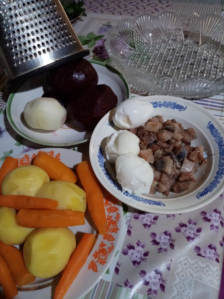 Приветствую Вас дорогие друзья на моем канале! Наступают холода и все овощи убраны с участка в погреба и подвалы, ну и мы все почистили с участка и убрали. Набрали свеклы,моркови,картофеля , купили селедочку и я хочу с вами поделиться очень простым рецептом салата "селедка под шубой". Этот салат готовит моя семья очень давно. Моя двоюродная тетя вспоминает сколько деревенских свадеб пропустила не пробовала этот салат, а теперь очень ей нравится,постоянно теперь готовит! Нам понадобится: Способ приготовления: Соленую сельдь помыть, почистить (снять кожу),отделить от костей и нарезать кубиками. Приготовленную свеклу,морковь,картофель для салата отварить или запечь в духовке в фольге( я всегда запекаю при температуре 150-160 градусов примерно час,овощи получаются вкуснее). Остудить и почистить. Яйца предварительно сварить и остудить.Лук почистить и порезать мелкими кубиками. Когда все подготовлено приступаем к приготовлению, т.е начинаем собирать салат. Берем красивую глубокую посуд