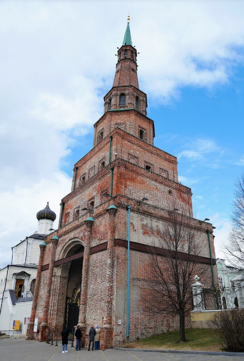 Башня Сююмбике высотою 58 м – жемчужина Казанского Кремля. Ее шпиль отклоняется от вертикали на 2 м, поэтому в народе сооружение прозвали «падающей башней». Конструкция похожа на Спасскую и Боровицкую башни столичного Кремля, но имеет восточный орнамент. Здесь вы увидите изящные полуколонны с фасадной стороны, сквозные ворота, полуовальные окна. Фундаментом послужили дубовые сваи, стены – из кирпича. Сооружение насчитывает 7 ярусов. На вершине – зеленый шпиль с мусульманским полумесяцем.