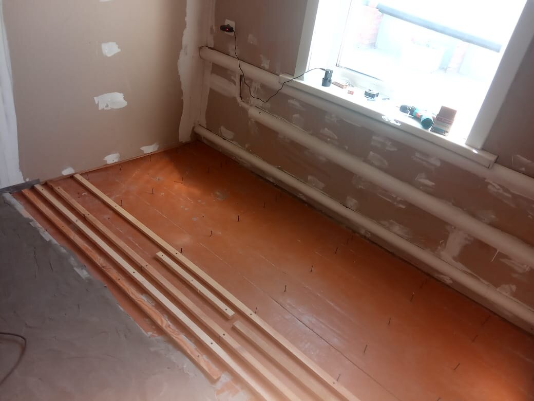Приветствую всех кто зашел на мой канал! Не так давно переехал в частный дом на земле. Все вроде хорошо хоть и дом старый. Стены все зашиты гипсокартоном, а вот полы почему то не стали ровнять. Думаю решили мне их оставить. Просто бросили сверху ДСП и на этом все. ДСП со временем приняло форму кривого пола. Конечно установив мебель в комнатах я пришел в ужас на сколько все плохо. Решил я в первую очередь начать с комнаты ребенка т.к. он пошел в первый класс. И как говорится с нуля решил ее сразу сделать. Поменять обои и т.д. Пол решил ровнять с минимальными затратами т.е. не стал его срывать, а решил ровнять на поверхности какую имею. Начитался в интернете всякого и решил браться за дело. Пол покатом в сторону окна сантиметров на 7 примерно. Полностью заменить пол дороговато решил сделать на деревянном полу стяжку. Так вот, что, я сделал прикупил немного деревянных реек 2 на 3 см. и просто закрепил их саморезами. Для того чтобы меньше израсходовать бетон. На первой половине комнаты р