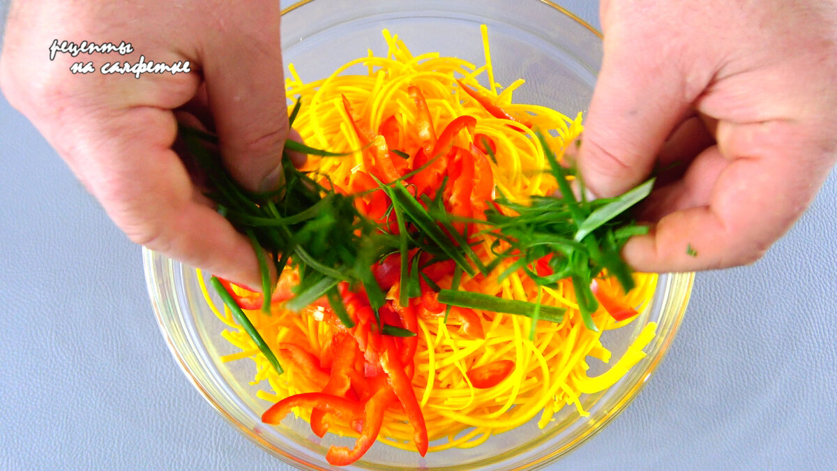 Тыква настолько универсальна, что готовят из нее и десерты и супы и вторые блюда. Она вкусная и в соленом и в сладком виде. В моей семье тыква частый гость. Мы все ее едим с удовольствием. Если вы так же как и мы, любитель тыквы, тогда предлагаю вам попробовать приготовить вкусный и простой салат из сырой тыквы. Не удивляйтесь. Сырая тыква очень полезна для пищевого тракта. Интересно как приготовить салат с сырой тыквой? Тогда приглашаю к себе на кухню, где я покажу и расскажу как это сделать. ВИДЕО РЕЦЕПТ: ПОШАГОВЫЙ РЕЦЕПТ С ФОТО: Тыкву очищаю от кожуры и тру на терке для корейской моркови. Если у вас нет такой терки, трите на обычную. Сладкий перец нарезаю тонкой соломкой и добавляю к тыкве. Для салата я использую только перья зеленого лука. Нарезаю их сначала в длину примерно по 4-5 см, а потом тонкой соломкой. Добавляю в чашу. Выдавливаю чеснок. Грецкие орехи измельчаю ножом. Не стоит измельчать слишком мелко. Вкуснее, когда орешки чувствуются. Если у вас нет грецких орехов, испо