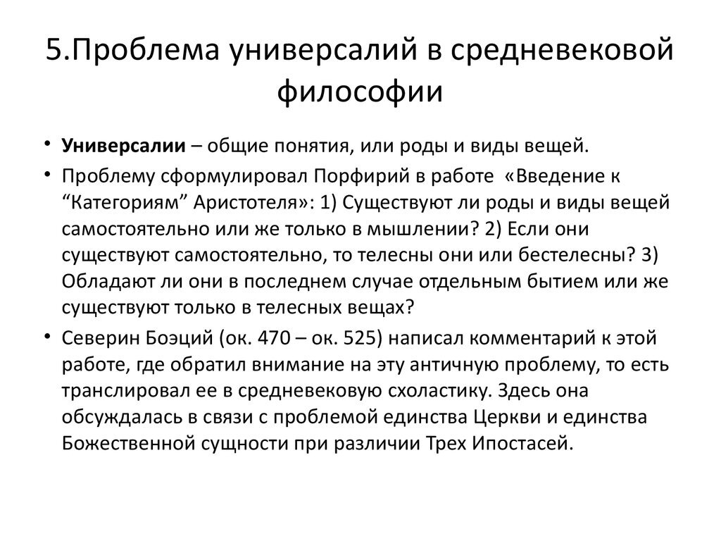 В том виде, в котором она обсуждалась в Средневековье, проблема универсалий впервые была поставлена в работах неоплатоника Порфирия, хотя в средневековую схоластику она вошла через Боэция и его комментарии к работам Порфирия.