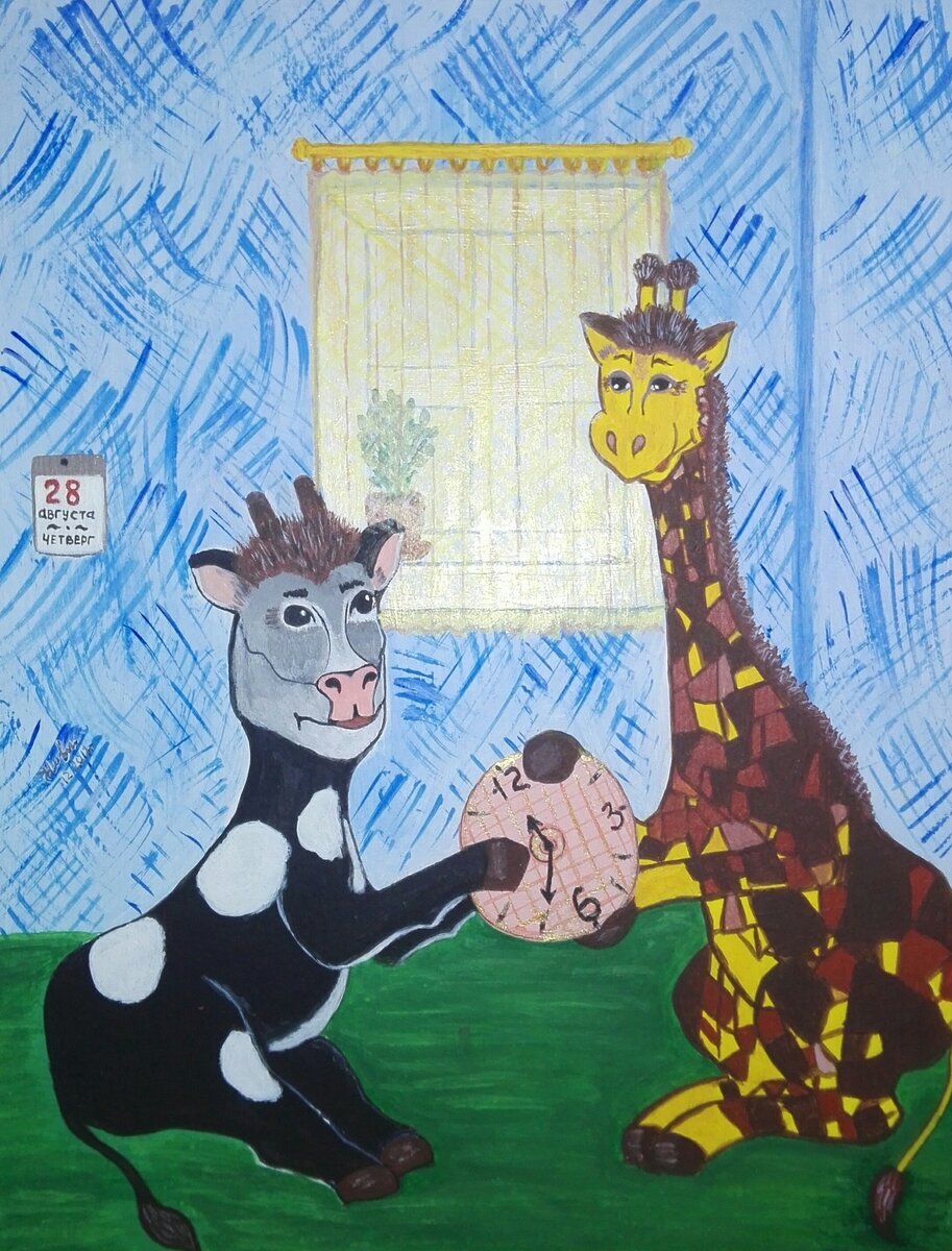 ...«Странно!.. Может быть, в календаре ошибка?» — подумал Гоша, посмотрев на видневшееся на нем число, которое по-прежнему напоминало, что до конца каникул остались сегодня, завтра и ещё один самый последний день. «И зачем мне подарили этот календарь?! Так я мог бы гулять и не расстраиваться из-за каких-то чисел на нём, — рассердился Гоша и отвернулся от календаря в другую сторону. — И вообще, если больше не смотреть на него, то ничего и не будет напоминать о конце каникул». «Тик-так, тик-так, тик-так», — послышалось в тишине. — Так, а тикает что?.. Что это тикает?.. Часы?! А-а-а — теперь вы напоминаете! — злился он. — Что же делать?.. Надо бы с Быкой посоветоваться. Как только Быка пришёл, они сразу же начали разбираться со временем, которого так мало. — Время никак не удлинить, — жаловался Гоша. — Я с утра проверял по-разному — ничего не получается. — Это, му-у, почему? — спросил Быка. — Вот когда ты каникулы ждёшь — время как идёт? — Медленно, — ответил Гоша. — А когда каникулы нач