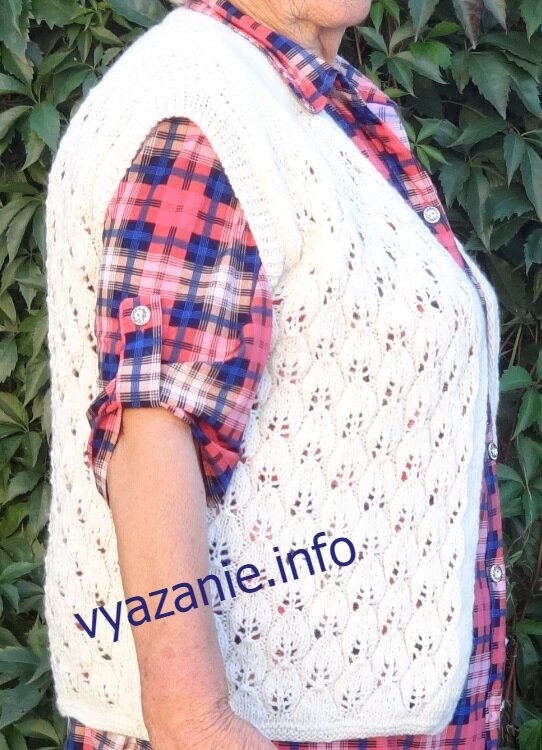 Хотите порадовать близкого человека тёплым подарком? Свяжите жилет, или по-другому, безрукавку. Вяжется легко, носится долго, незаменима в прохладных помещениях, может стать базовой частью гардероба. У нас безрукавка на 54 размер, рост 150 см. Спицы №2,5, пряжа рассказовская ангора (750 м в 250 г) 250 г. Описание. Длина готового жилета 61 см, ширина спинки 54 см. Длина проймы — 22 см. Вязать будем 5 деталей снизу вверх. Спинка жилета. На спицу набираем 108 петель. 7 рядов платочной вязки. То есть, все петли лицевые в каждом ряду. Дальше вяжем узор. Нужно будет равномерно добавить в рисунок петли. Для этого в первом ряду схемы вместо «трёх вместе» вяжем лицевую петлю. Дальше всё по схеме. По бокам, если будут лишние петли, вяжем их лицевыми. В шве это будет смотреться так: Узор листики. Раппорт составляет 14 петель и 12 рядов. 14х8 + 1 петля для симметрии + 2 кромочные = 115. Чётные ряды вяжем, как смотрят петли. Изнаночные классические, а не бабушкины. В зависимости от того, как вязать