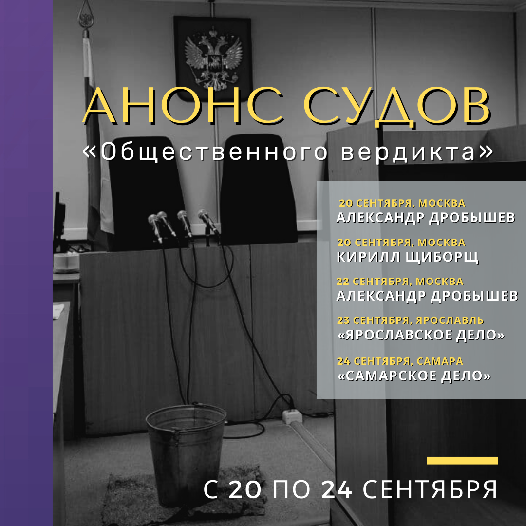 📌 Потерпевшие по «Ярославскому делу» обратились в суд с исками о компенсации морального вреда на сумму 1 млн рублей. Подробности в анонсе судов «Общественного вердикта»: 20 сентября ➡️ В Хамовническом суде Москвы рассматривается жалоба на бездействие следствия по заявлению Александра Дробышева, избитого полицейским в сентябре 2020 года в парке Горького. К полицейскому Дробышев обратился за помощью, но получил ногой в пах. Последствия удара – тяжелая травма половых органов. В ноябре 2020 года мы подали жалобу в Хамовнический суд на бездействие Следственного управления по ЦАО. Тогда суд отказал в принятии жалобы, но мы это обжаловали, и сейчас жалоба, наконец, рассматривается. При этом из обжалованного постановления суда стало известно, что заявление Дробышева было перенаправлено из Следственного управления по ЦАО в Замоскворецкий межрайонный следственный отдел. Поэтому аналогичную жалобу на бездействие уже Замоскворецкого следствия мы направили в Таганский районный суд, который в удовл