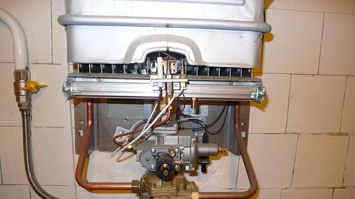 - Для начала необходимо снять с газовой колонки фурнитуру (ручки и пр.), после чего снять кожух. Затем необходимо определиться с трубками подвода воды. Будьте внимательны на данном этапе, чтобы случайно не тронуть газ. Далее чаще всего советуют снять теплообменник и промыть его вне колонки. Однако можно поступить и по-другому.