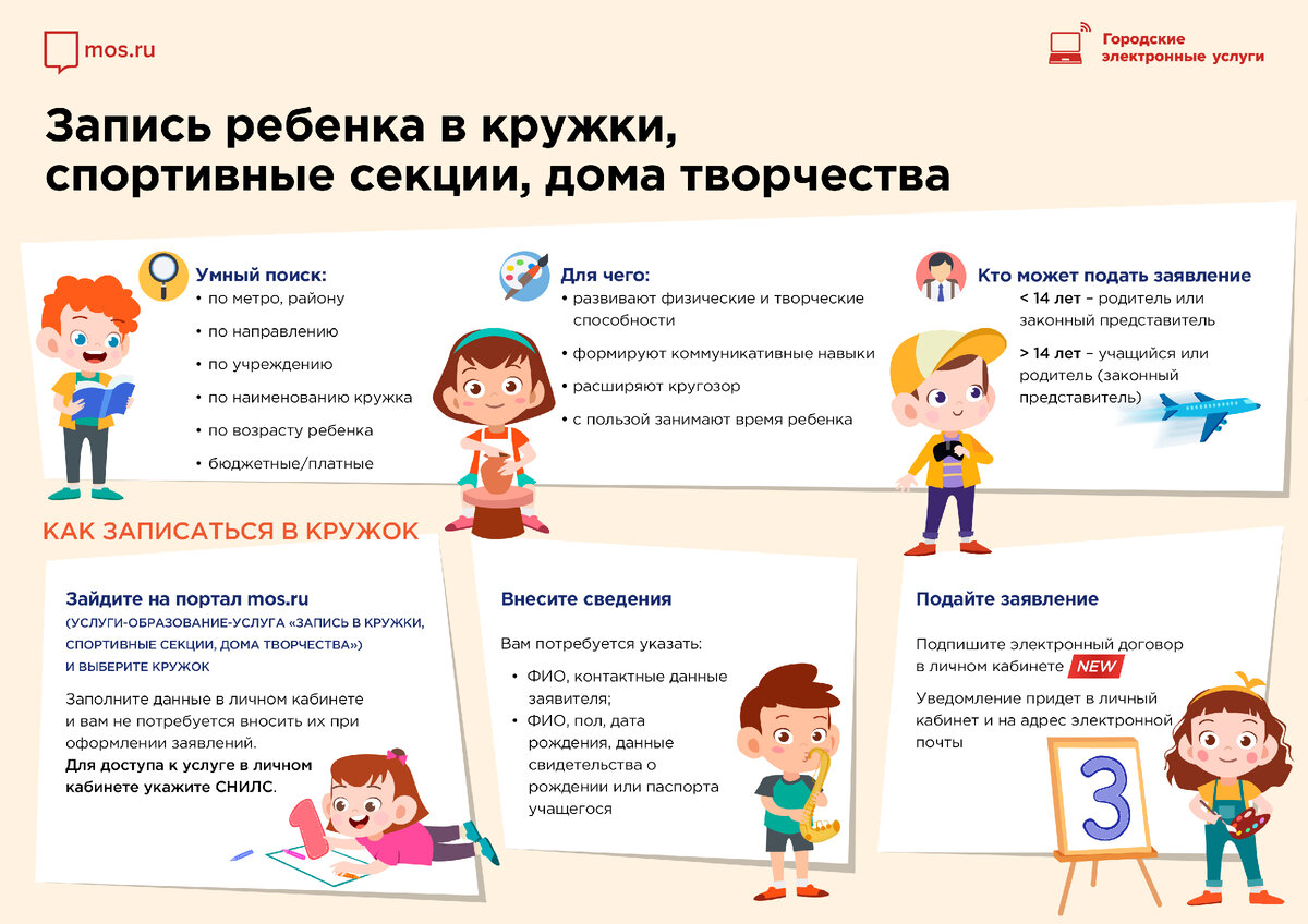 🤖 Робототехника, хореография, боевые искусства: как записать ребенка в кружок или секцию на mos.ru? ✅1. Пройдите по ссылке: mos.ru/pgu/ru/services/procedure/0/0/7700000000162415320 ✅2. Воспользуйтесь расширенным поиском, с его помощью можно найти нужную секцию или кружок по определенным параметрам. Необходимо указать пол и возраст ребенка, район, станцию метро или конкретное учреждение, а также вид деятельности (например, «Психология», «Наука и техника», «Музыка») и профиль. 🙇🏻♀👍🏻 Кроме того, пользователям доступен выбор направления программы дополнительного образования (секции, кружки, студии, спортивная подготовка или детские школы искусств). Можно указать желаемое время занятий — утреннее, дневное или вечернее. ✅3. После настройки параметров на странице отобразится список подходящих программ. Останется выбрать кружок или секцию, дату начала занятий из доступных, ввести нужные данные и нажать на кнопку «Отправить». #uslugiMos #школьнаяпора2021
