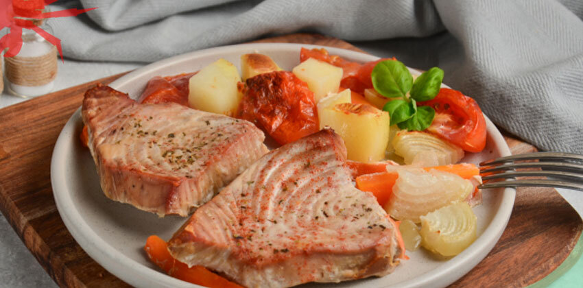 Ингредиенты: Стейки тунца размораживаем, промываем под проточной водой и кладем на бумажное полотенце. Очищаем и промываем овощи. Картофель, морковь и лук нарезаем на небольшие кусочки. Берем форму для запекания, смазываем маслом, выкладываем подготовленные овощи. Поверх овощей кладем филе тунца и нарезанные дольками помидоры. Солим, посыпаем специями. Накрываем форму фольгой. Разогреваем духовку до 180 градусов, ставим противень с тунцом. Через 10 минут снимаем фольгу и готовим еще 15 минут. Достаем, украшаем зеленью Блюдо готово. Приятного аппетита! Источник: https://wildcrab.ru/news?id=1278