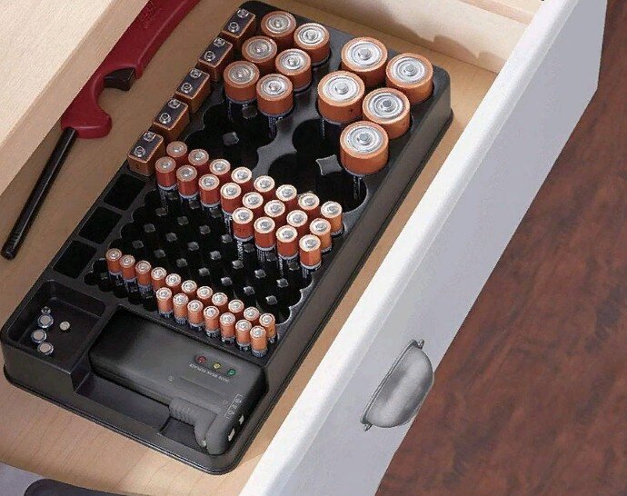 Товар для всех любителей порядка, а также тех, кто не может найти в нужный момент нужную батарейку. Контейнер вмещает более 100 батареек различных типов: AA, AAA, Крона, «таблетки» и др. Все они фиксируются в отдельных ячейках под нужный размер. Что самое замечательное, в комплекте идет простой тестер для их быстрой проверки.