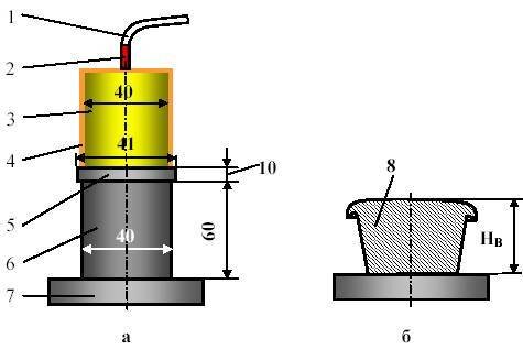 1 – огнепроводный шнур; 2 – капсюль детонатор; 3 – заряд испытуемого ВВ (50 г); 4 – бумажная оболочка; 5 – стальная пластина; 6 – свинцовый столбик; 7 – металлическая плита; (б) – свинцовый столбик после обжатия.