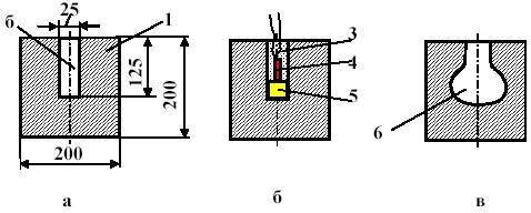 Для определения относительной работоспособности ВВ наиболее широко применяется метод свинцовой бомбы (проба Трауцля), принятый на Втором Международном конгрессе прикладной химии. Бомба Трауцля представляет собой свинцовый цилиндр диаметром и высотой 200 мм, в которой имеется цилиндрическое несквозное отверстие диаметром 25 мм и глубиной 125 мм, (см. рис.15). Бомбу отливают из рафинированного свинца при температуре 390–400°С. На дно отверстия помещают заряд ВВ весом 10 г в бумажной гильзе. На заряд ВВ устанавливают электродетонатор ЭД-8-Э, а свободную часть канала бомбы засыпают сухим кварцевым песком. Испытания проводят при температуре +10 °С. При изменении температуры производят соответствующие поправки: при 0 °С полученную величину расширения увеличивают на 5%, при +30 °С – уменьшают на 6%. В бомбе в районе размещения заряда при взрыве образуется полость (см. рис.15, в). Расширение канала бомбы происходит за счет действия давления продуктов взрыва электродетонатора и испытуемого ВВ. Мерой относительной работоспособности ВВ (в см3) является величина расширевшегося объема канала свинцовой бомбы за вычетом начального объема (61 см3) и расширения (30 см3) за счет взрыва электродетонатора.