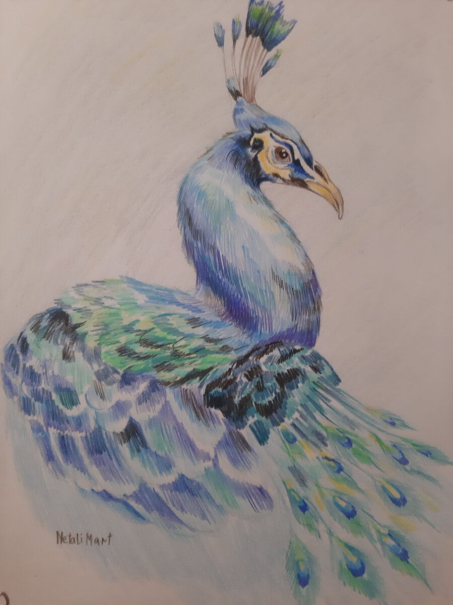 Павлин. Бумага, цветные карандаши Благодаря своему красочному оперению, павлин является символом солнца в южных азиатских странах. Он олицетворял разнообразие, радость жизни, красоту, долголетие и любовь. Пышный хвост птицы ассоциировался с благородством, властностью, славой, величием и гордостью. Мифический и поэтический образ Павлина, основанный на внешних особенностях этой птицы (форма и характерная расцветка хвоста, походка и пр.), и раскрывает широкий спектр астральной символики — от космоса в его полноте и звёздного неба до лунного и солнечного круга. Люди создали и пересказали много легенд и сказание об этой птице. Интересно, что в ирано-суфийском мифе бог сотворил мировой дух в образе Павлина и дал ему посмотреть на его собственное отражение в чудесном зеркале, отчего Павлин, потрясённый величием увиденного, пролил капельки пота, из которых произошли все остальные существа. В Древней Греции «звёзды» («глазки»), усеивающие павлиний хвост, назывались очами Аргоса, которые по прик