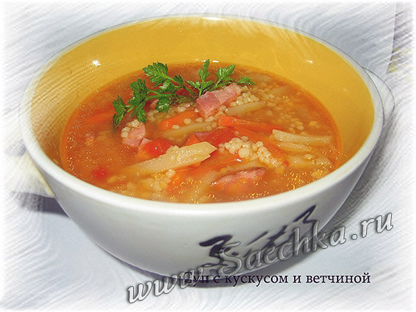 Простой, вкусный и густой суп с кус-кусом и ветчиной приготовлен в мультиварке.
