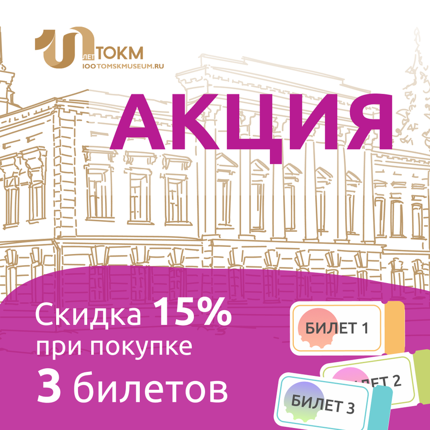 Всю осень у нас действует акция: при единовременной покупке 3-х билетов вы получаете скидку 15% в музей на любую выставку. Все три билета должны быть куплены на одну конкретную выставку, дату и время.