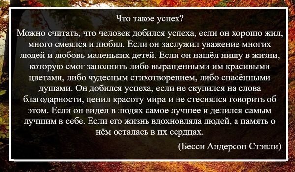 Один из лучших вариантов ответ на вопрос «что такое успех» дала американская писательница Бесси Андерсон Стэнли, автор поэмы «что такое успех?»:
