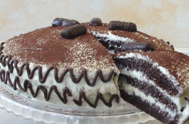 Ингредиенты для «Шоколадный Торт Капучино»: Бисквит Крем Пропитка Берем 6 яиц, добавляем 6 ст л сахара и хорошо взобьем миксером минут 5, чтобы яйца побелели и масса увеличилась в объёме. Добавляем 60 грамм измельченных орехов, хорошо перемешаем венчиком. Просеем 3,5 ст л муки, потом 2 ст л какао и 2 ч л разрыхлителя. Хорошо размешаем венчиком, чтобы не было комочков. Должно получиться гладкое однородное тесто. Форма у меня 24 см, дно я застелила пергаментом. Выливаем тесто в форму, запекаем в разогретой до 180' духовке 40 минут. Готовый бисквит вынимаем из формы, полностью остужаем и даём отлежаться минимум 2-3 часа.
