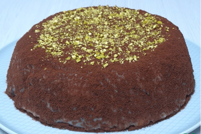 Украшаю какао-порошком и молотыми фисташками. И все! Можно угощаться. Попробуйте. Торт получается очень вкусный и "супер шоколадный"!