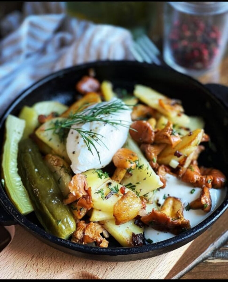 Ведь эту жареную с грибами картошку готовят почти в каждой семье нашей страны. Кстати, в вашей семье есть какие-то лайфхаки по приготовлению этой вкуснятины? Ну а я вам расскажу свой вариант, так что сохраняйте: На 2 порции: Картофель среднего размера ~5 шт; Лисички 250-300 гр; 1 небольшая луковица; Сливочное масло 1 ст л; Бекон гр 30; Укроп Для подачи: яйцо-пашот; сметана Соль, перец по вкусу. Грибы промойте как следует и обсушите; Как я уже показывала - я делаю это в сушке для зелени; Лук и бекон нарежьте мелким кубиком, картофель дольками; Добавьте к картофелю 1 ст л растительного масла и разотрите руками, чтобы масло смазало каждую дольку. Так он не будет слипаться в процессе жарки; Ещё немного масла добавьте на сковороду и разогрейте ее как следует. Выложите картофель и дайте ему схватиться около 2 минут до корочки, затем переверните лопаткой сверху вниз ( не мешая) и ещё раз обжарьте. Главное правило - не перемешивать картофель слишком часто Как только картофель более менее