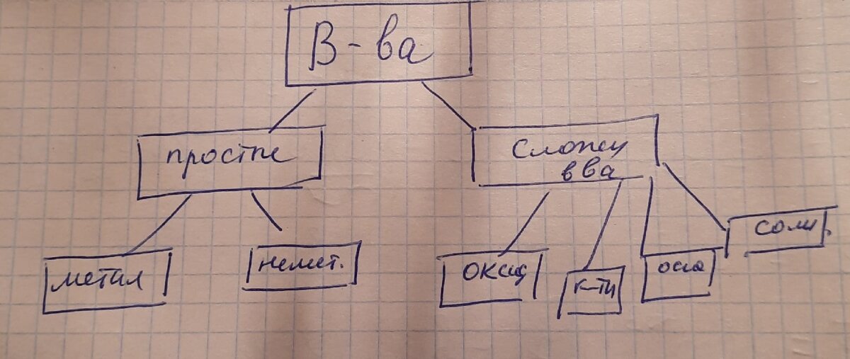 В этой статье, я расскажу на что делятся вещества. Как видно на картинке вещества делятся на простые и сложные Простые в свою очередь делятся на металлы и неметаллы Как определить металл перед нами или неметалл? Ответ прост, берем таблицу Менделеева и проводим прямую линию от бора (B) к астату (At) Все, что слева от линии это металлы, также все синие ячейки справа от линии тоже металлы, все остальное это неметаллы Сложные делятся на оксиды, кислоты, основания и соли Оксиды это вещества из двух элементов, один из которых кислород Кислоты это вещества, состоящие из атомов водорода и кислотного остатка Основания это вещества, состоящие из атомов металла и одной или нескольких гидроксильных (OH) групп Соли это вещества, состоящие из металла и кислотного остатка Обо всех этих группах я расскажу в отдельных статьях